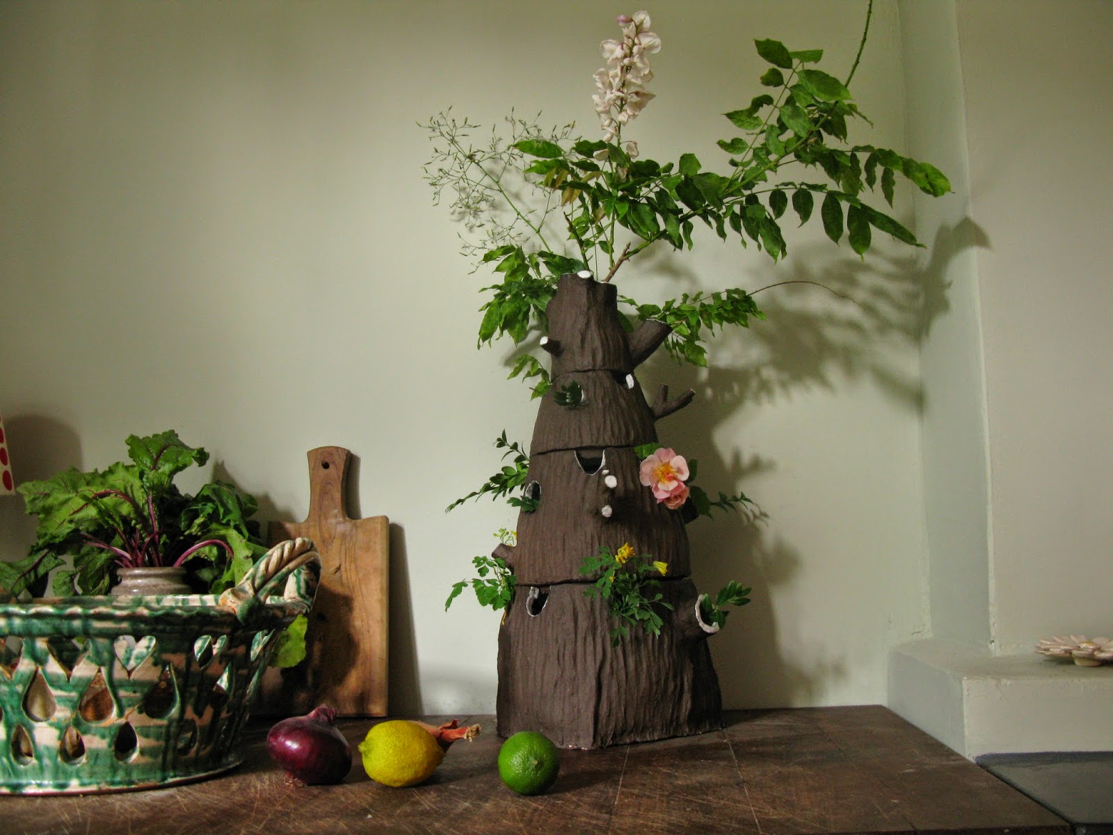 One of my tree trunk vases, with green leaves and flowers from the garden